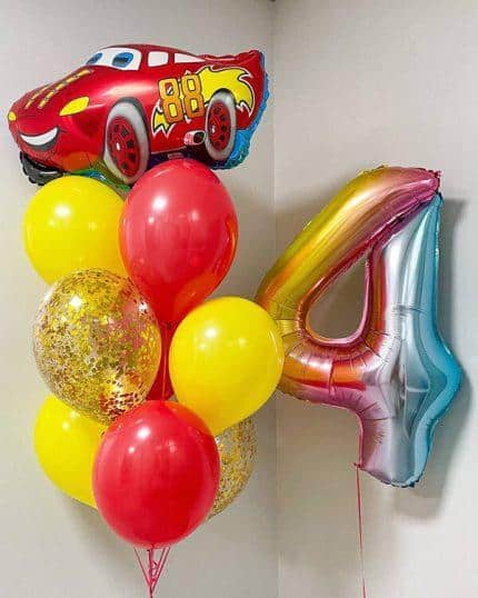 Особенно интересно выглядят композиции из воздушных шаров, созданные в форме машин из Тачек. Можно сделать например гоночный трек, используя шары разных цветов, или создать группу из нескольких шаров, которые вместе образуют машину. Также можно сделать шары в форме номерных знаков, на которых будет написано имя именинника или другая нужная надпись.